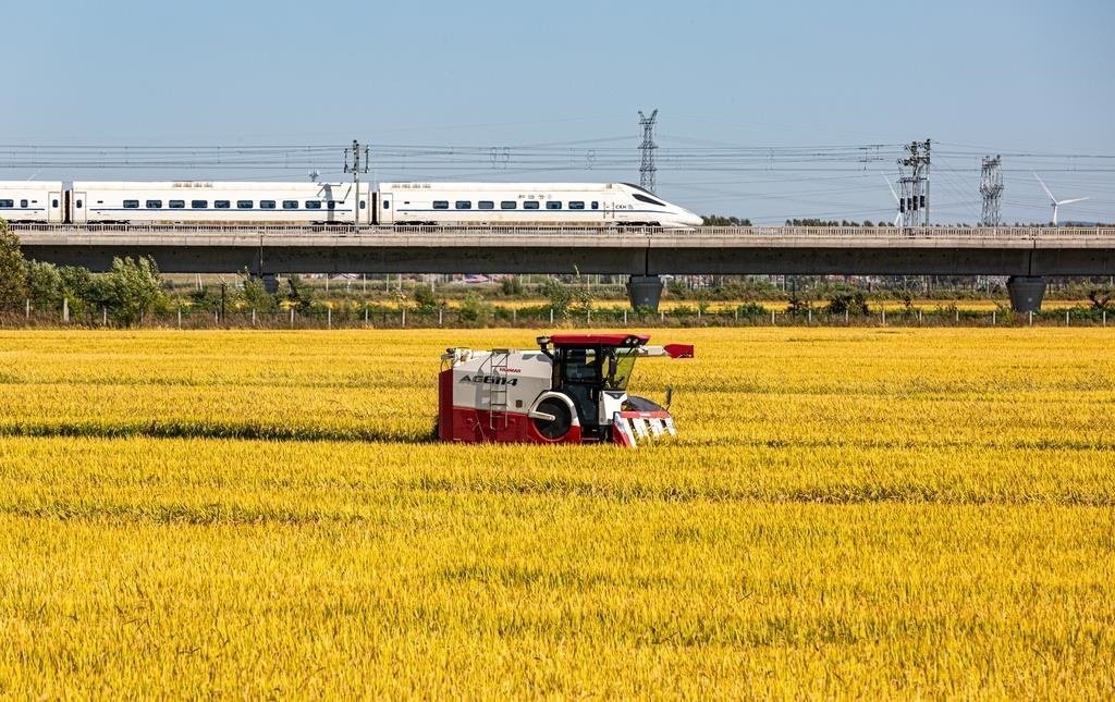 △2024年9月18日,黑龍江省哈爾濱市阿城區(qū)料甸街道三家子屯,農民正在收割水稻。