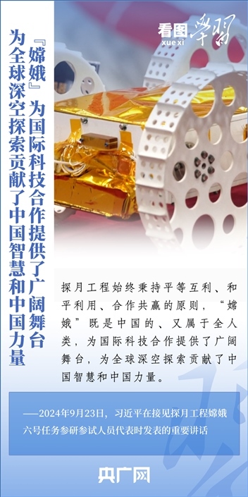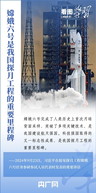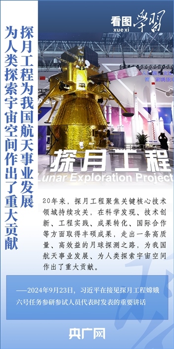 中國探月工程成果凝結(jié)著我國幾代航天人的智慧和心血。9月23日,習(xí)近平總書記接見探月工程嫦娥六號任務(wù)參研參試人員代表并發(fā)表重要講話??倳浉叨瓤隙ㄦ隙鹆柸蝿?wù)成功的重要意義,以及探月工程為我國航天事業(yè)發(fā)展、為人類探索宇宙空間作出的重大貢獻(xiàn),勉勵(lì)航天戰(zhàn)線工作者再接再厲、乘勢而上,為建設(shè)航天強(qiáng)國再立新功。一起來學(xué)習(xí)!