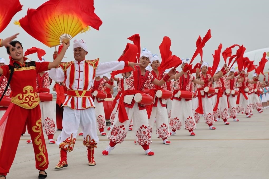 2023年5月17日下午,出席中國-中亞峰會的哈薩克斯坦總統(tǒng)托卡耶夫抵達陜西省西安市。當(dāng)?shù)孛癖娨詿崆榈难?、歡快的秧歌等民間藝術(shù)表演歡迎貴賓到來。新華社記者 邢廣利 攝