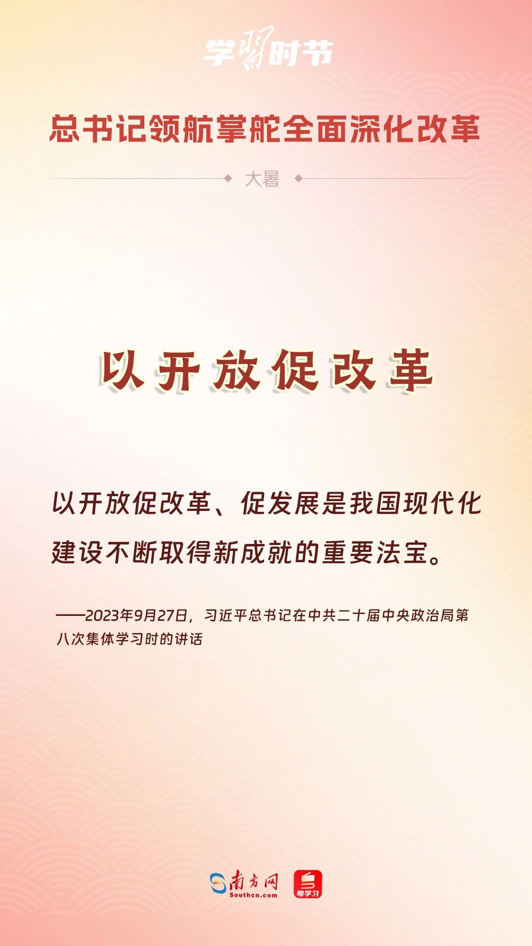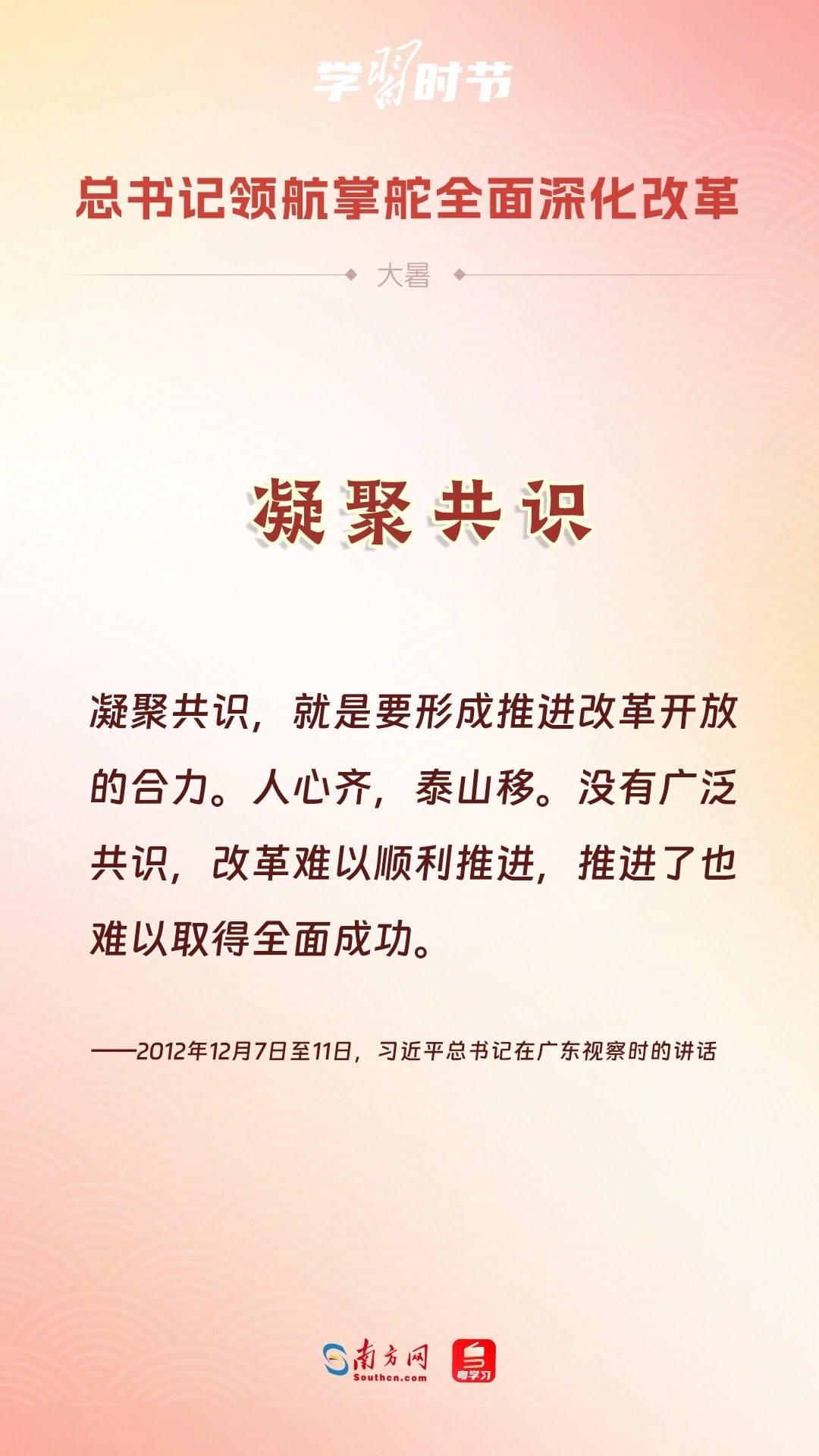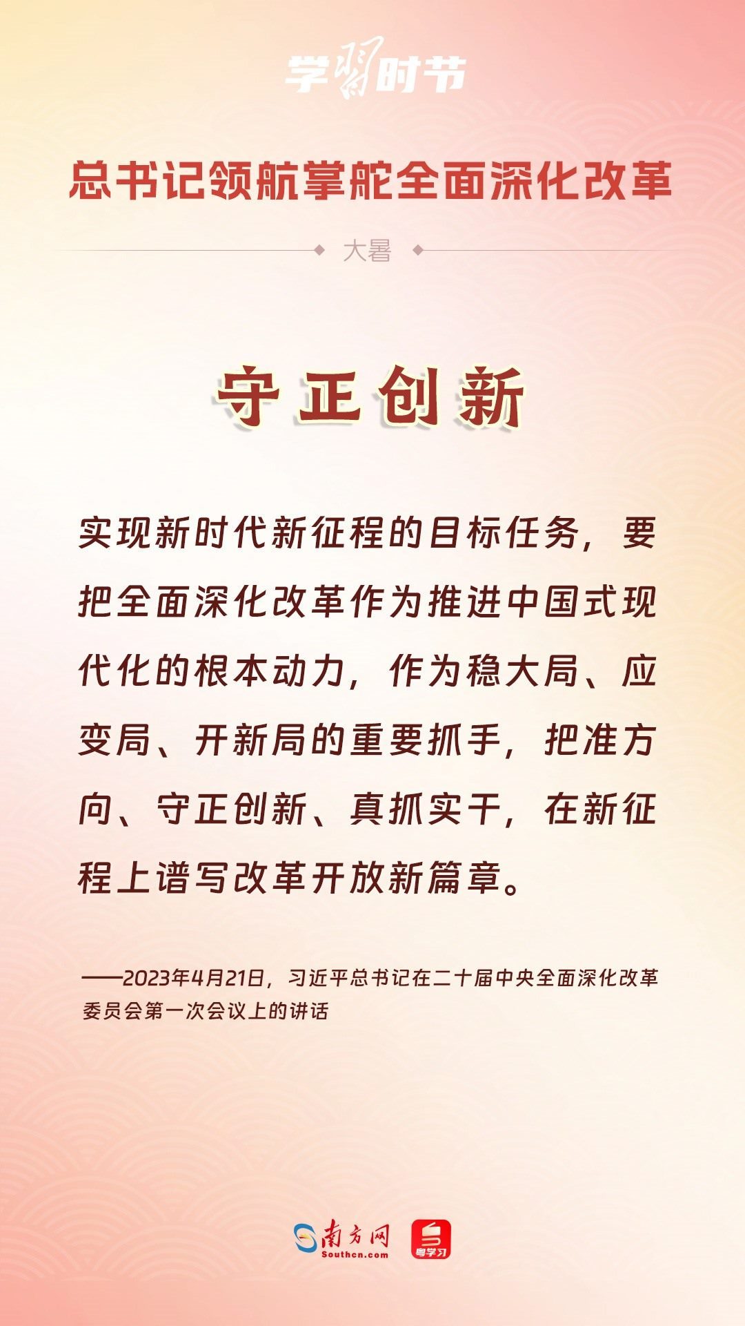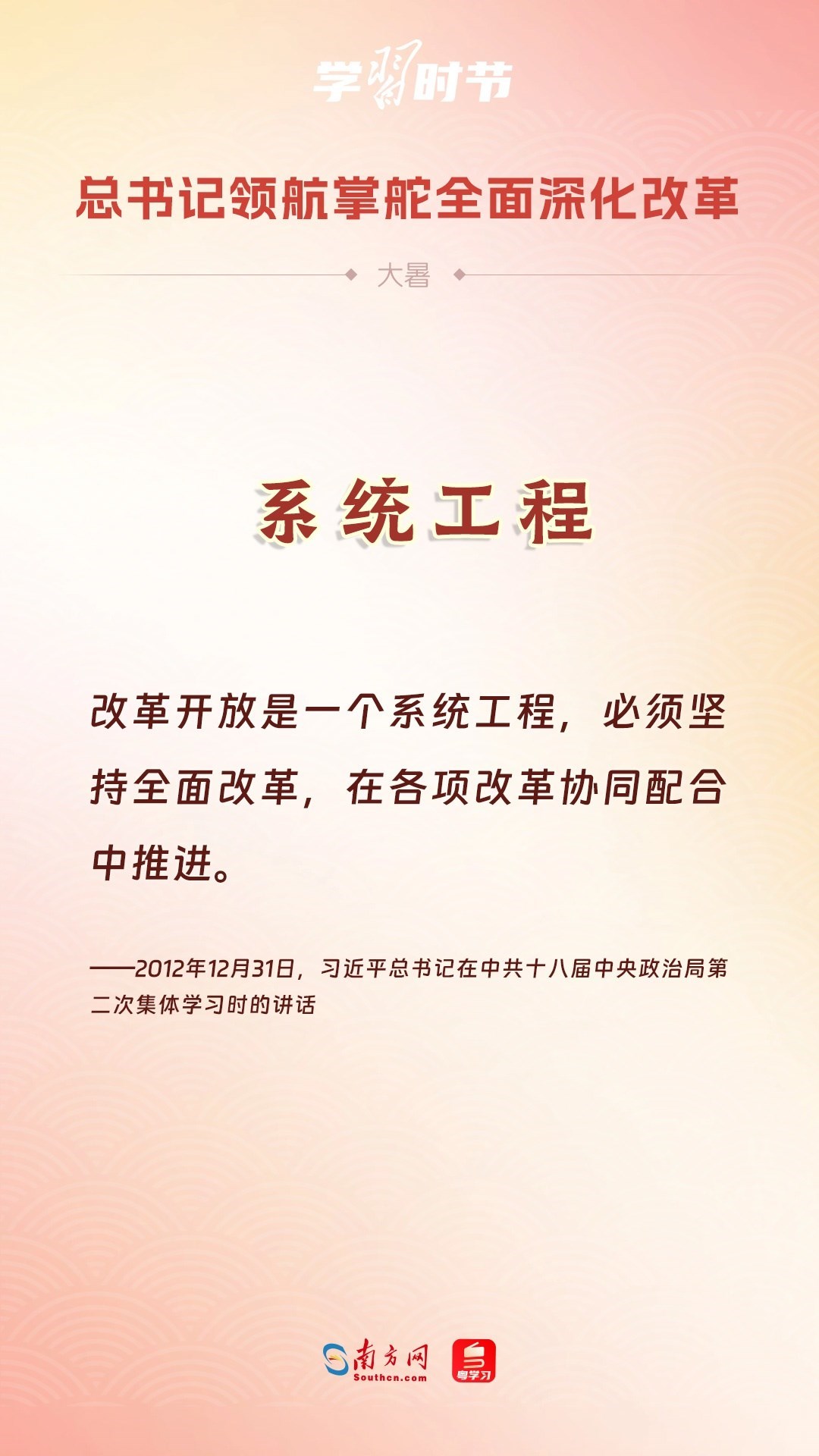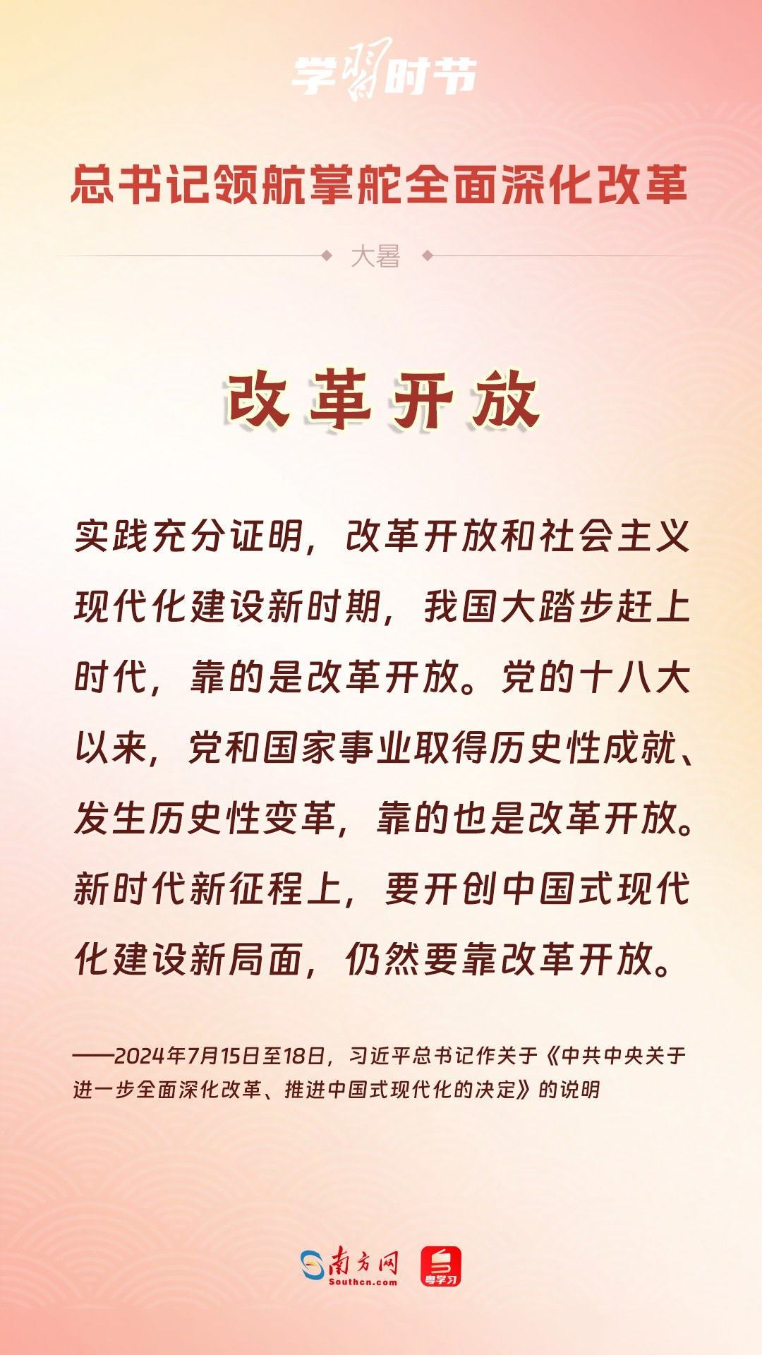 黨的十八大以來,習近平總書記親自領導、親自部署、親自推動全面深化改革工作,推動全面深化改革事業(yè)在攻堅克難中不斷邁上新臺階、取得新勝利。在驕陽似火的大暑時節(jié),通過一組海報,讓我們共同學習習近平總書記關于“全面深化改革”的重要論述。