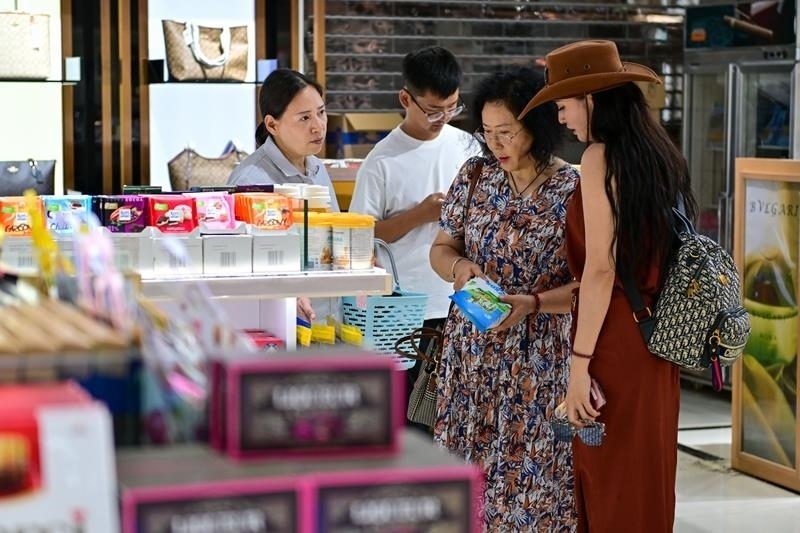 △2024年7月26日,在中哈霍爾果斯國際邊境合作中心,游客在免稅店挑選商品。今年以來,新疆各大旅游目的地游客量持續(xù)攀升。