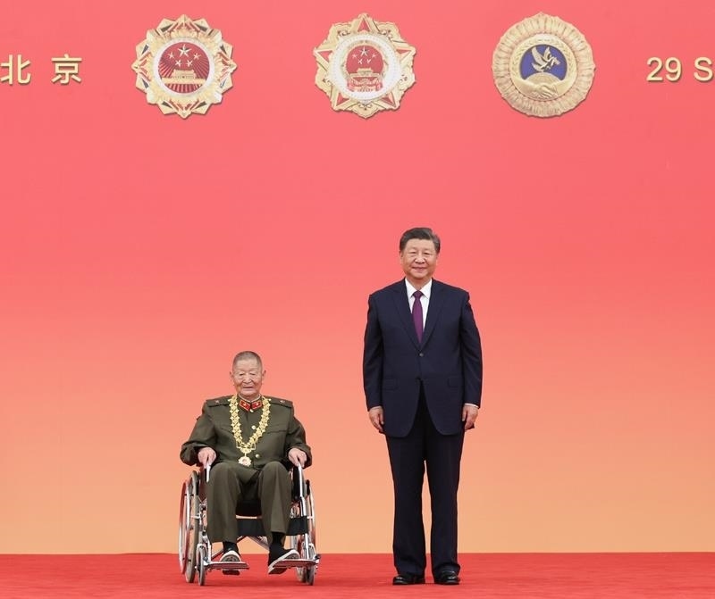 △2024年9月29日,國家勛章和國家榮譽稱號頒授儀式上,習近平總書記向“共和國勛章”獲得者黃宗德頒授勛章后合影。