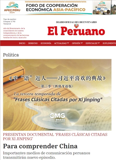 11月14日,秘魯最具影響力的官方報紙《秘魯人報》刊發(fā)節(jié)目在秘魯落播的消息。文章指出,《平“語”近人——習近平喜歡的典故》第三季展現(xiàn)了中華民族開放包容、兼收并蓄的文化胸懷,闡釋了習近平主席提出的推動構(gòu)建人類命運共同體的這一重大理念,是對“建設(shè)一個什么樣的世界、怎樣建設(shè)這個世界”給出的中國方案?!睹佤斎藞蟆诽乜婵l(fā)《平“語”近人——習近平喜歡的典故》第三季(西班牙語版)將在秘魯主流媒體落播特稿?!睹佤斎藞蟆饭倬W(wǎng)也同步刊發(fā)了節(jié)目預(yù)告消息和海報。