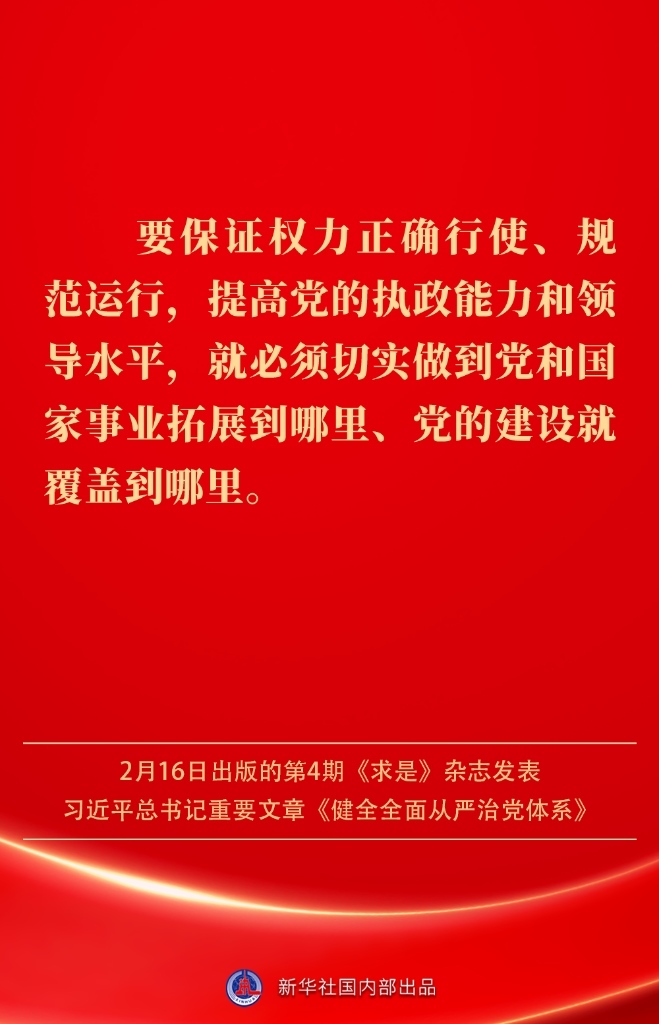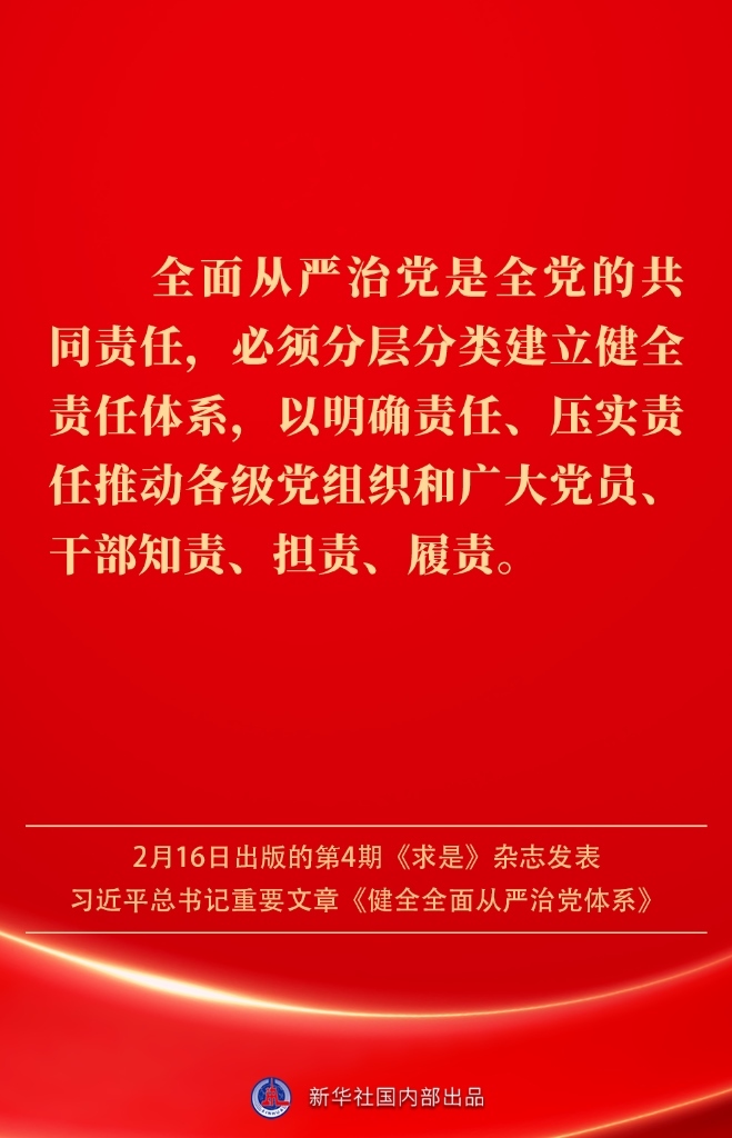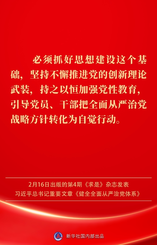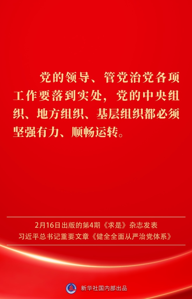 2月16日出版的第4期《求是》雜志發(fā)表習(xí)近平總書記重要文章《健全全面從嚴(yán)治黨體系》。如何進(jìn)一步健全要素齊全、功能完備、科學(xué)規(guī)范、運行高效的全面從嚴(yán)治黨體系?習(xí)近平總書記闡明要旨——