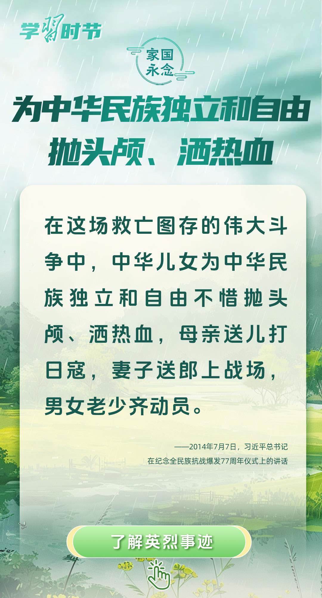 今年是中國人民抗日戰(zhàn)爭暨世界反法西斯戰(zhàn)爭勝利80周年、中國人民志愿軍抗美援朝出國作戰(zhàn)75周年。習近平總書記曾說:“對一切為國家、為民族、為和平付出寶貴生命的人們,不管時代怎樣變化,我們都要永遠銘記他們的犧牲和奉獻?!苯裉煳覀兯鶕碛械囊磺校瑹o不凝結著英雄、英烈們的奉獻付出乃至巨大犧牲。
