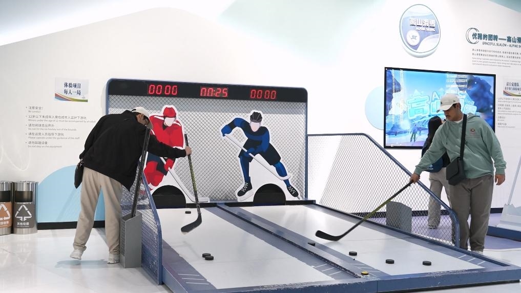 4月6日,北京奧運(yùn)博物館,阿聯(lián)酋學(xué)生們體驗(yàn)?zāi)M冰球。新華社記者 胡震澤 攝