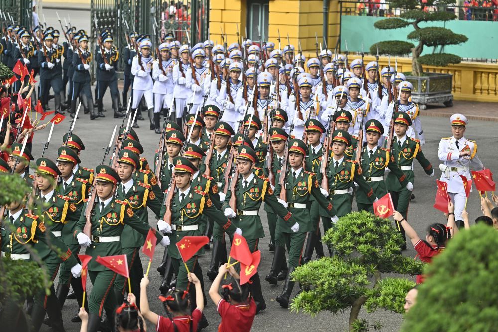 當(dāng)?shù)貢r(shí)間4月14日,中共中央總書記、國(guó)家主席習(xí)近平在河內(nèi)出席越共中央總書記蘇林舉行的歡迎儀式。