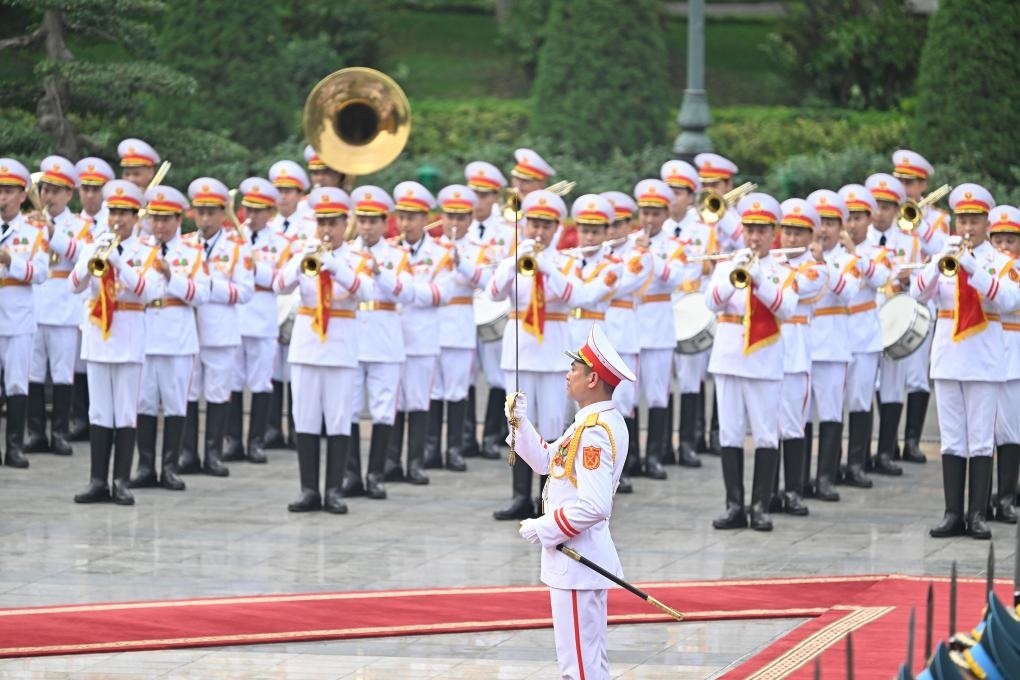 軍樂(lè)團(tuán)奏中越兩國(guó)國(guó)歌,鳴禮炮21響。