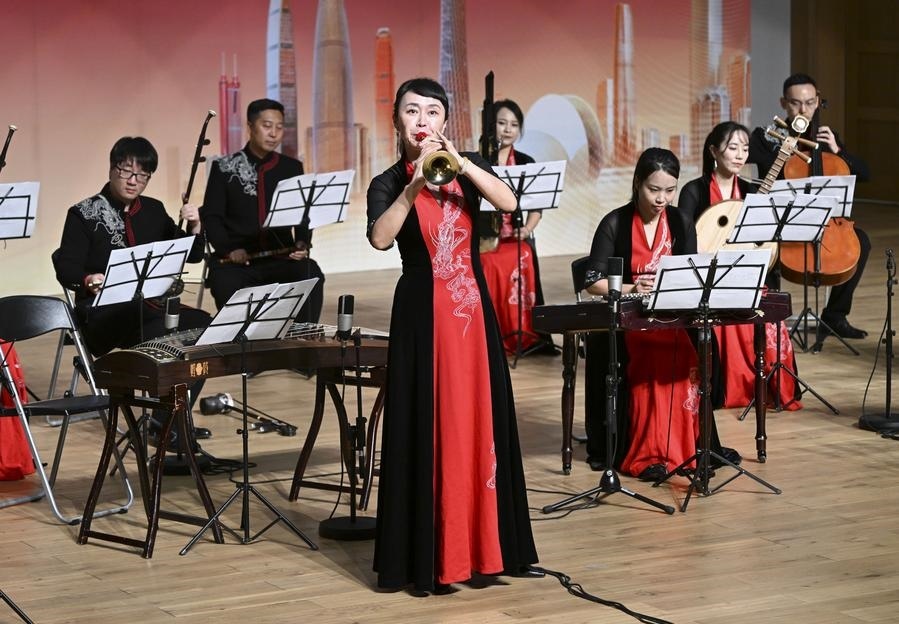 2023年11月24日,在馬來西亞雪蘭莪州的廈門大學馬來西亞分校,藝術家在音樂會上演奏。“絲路粵韻——廣東民族音樂會”當晚在廈門大學馬來西亞分校舉辦。新華社記者程一恒攝