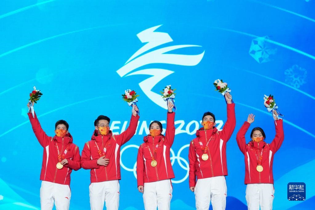 當日,北京2022年冬奧會短道速滑混合團體接力獎牌頒發(fā)儀式在北京賽區(qū)頒獎廣場舉行。