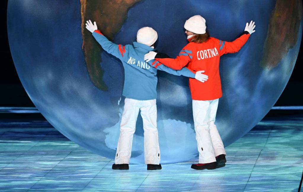 循著場(chǎng)地邊緣一道亮光,兩位意大利小朋友推動(dòng)手工制作的地球走向中央。下一屆冬奧會(huì)舉辦地八分鐘表演“雙城璧合·聚力聯(lián)輝”拉開(kāi)序幕。四年后,活力四射的時(shí)尚之都米蘭將攜手山川環(huán)繞的科爾蒂納丹佩佐,共襄冬奧盛會(huì)。山川與城市、自然與建筑相互映照,在共舞中寄寓著人類和自然間的彼此尊重、相互對(duì)話。