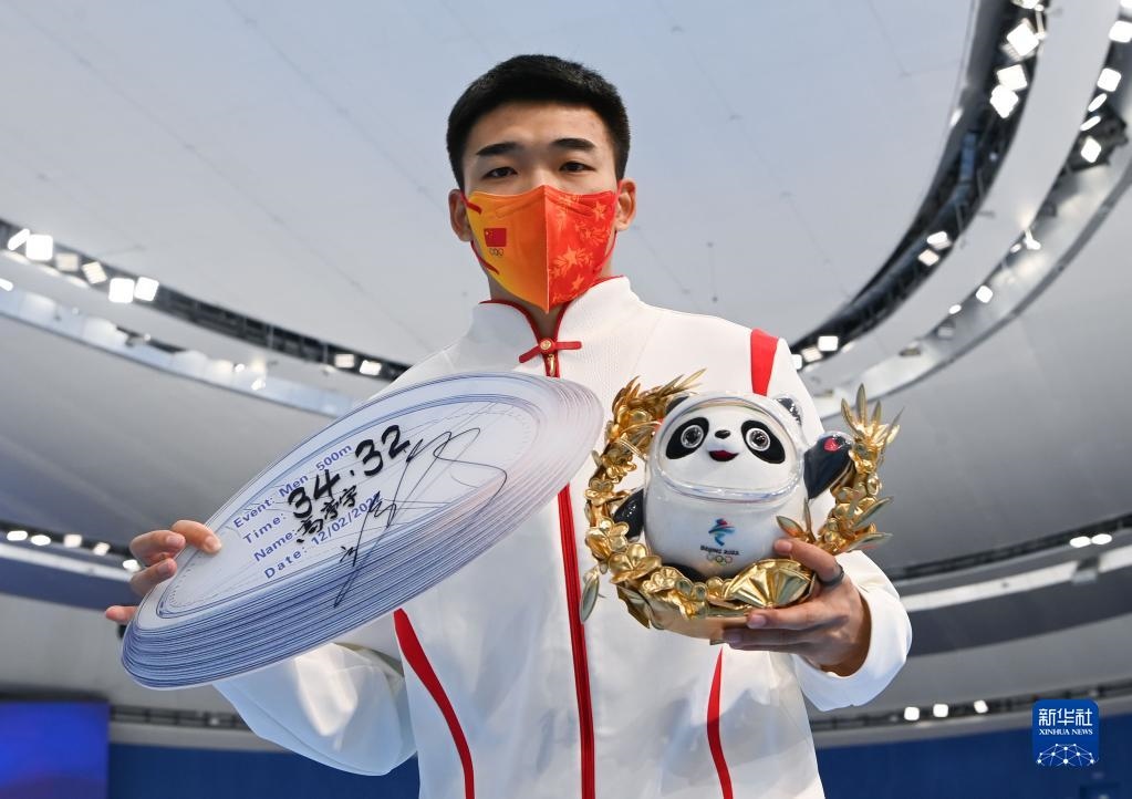 2月12日,冠軍中國(guó)隊(duì)選手高亭宇展示自己在速度滑冰男子500米決賽中的成績(jī)。新華社記者武巍攝