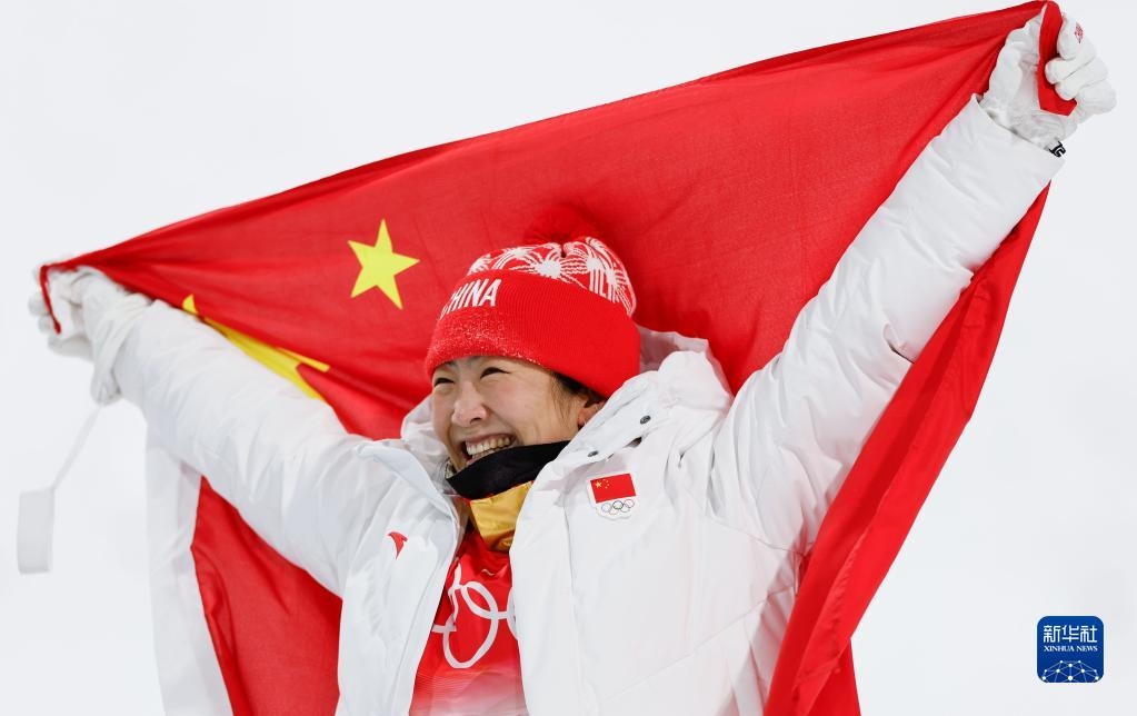 2月18日,冠軍中國(guó)隊(duì)選手谷愛(ài)凌在自由式滑雪女子U型場(chǎng)地技巧獎(jiǎng)牌頒發(fā)儀式上。新華社記者薛玉斌攝