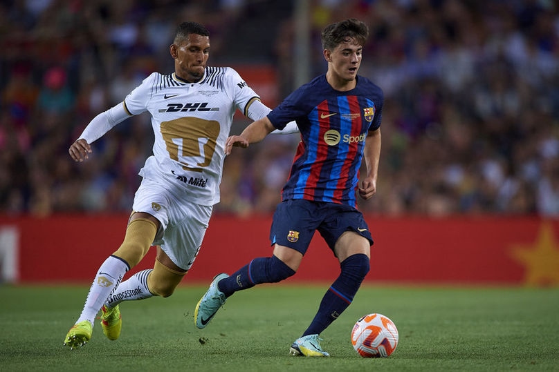 8月7日,在2022年甘伯杯足球賽中,效力于巴塞羅那隊的加維(右)與美洲獅隊球員梅里唐在比賽中拼搶。新華社發(fā)(帕布羅·莫拉諾攝)