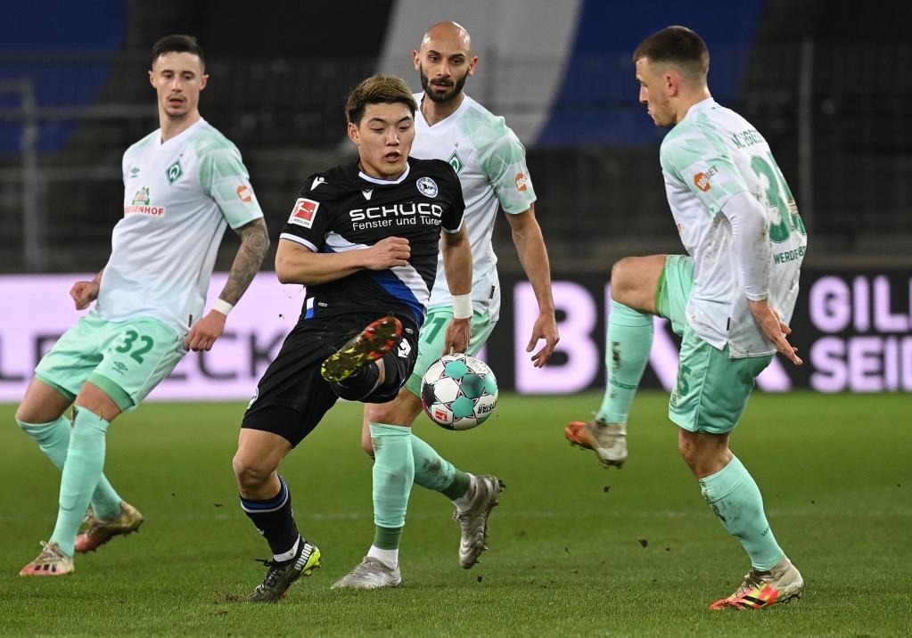 2021年3月10日,當(dāng)時(shí)效力于比勒菲爾德隊(duì)的日本球員堂安律(前左)在德甲比賽中帶球突破。他現(xiàn)在效力于德甲弗賴堡俱樂部。新華社發(fā)(烏爾里?!ず蚣{格爾 攝)