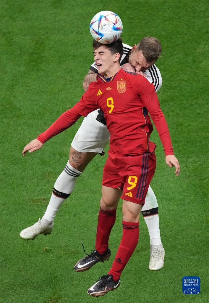 11月27日,西班牙隊球員加維(前)與德國隊球員戴維·勞姆在比賽中爭頂。新華社記者 陳誠 攝