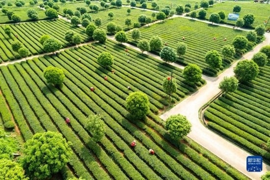 4月11日,在長(zhǎng)沙望城烏山貢茶基地,茶農(nóng)采摘春茶(無人機(jī)照片)。