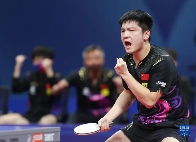 2022年10月9日,中國(guó)隊(duì)選手樊振東在比賽中慶祝得分,他以3:0戰(zhàn)勝德國(guó)隊(duì)選手貝內(nèi)迪克特·杜達(dá)。當(dāng)日,在成都世乒賽男團(tuán)決賽中,中國(guó)乒乓球男隊(duì)3:0戰(zhàn)勝德國(guó)隊(duì)。 新華社記者江宏景攝