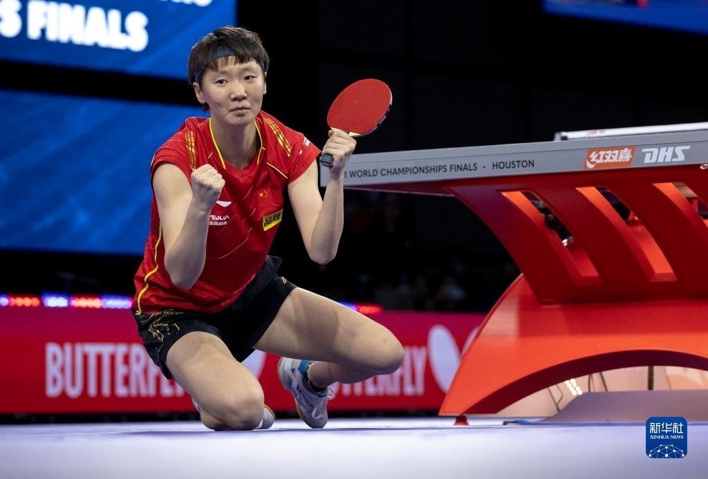 2021年11月29日,王曼昱慶祝奪冠。當(dāng)日,在美國(guó)休斯敦進(jìn)行的2021世界乒乓球錦標(biāo)賽女子單打決賽中,中國(guó)選手王曼昱以4:2戰(zhàn)勝隊(duì)友孫穎莎,奪得冠軍。 新華社瓦格納攝