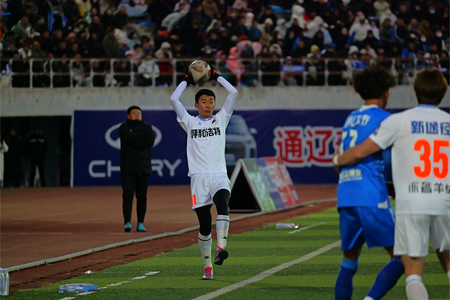 比賽伊始,兩隊(duì)直接開啟高速對(duì)抗模式,攻防節(jié)奏緊湊,轉(zhuǎn)換效率拉滿,為現(xiàn)場(chǎng)4萬(wàn)余觀眾呈現(xiàn)了開局即高潮的對(duì)決。雙方輪番發(fā)起高強(qiáng)度攻勢(shì),給對(duì)方球門制造實(shí)質(zhì)性威脅,呼和浩特隊(duì)小組賽表現(xiàn)亮眼的16號(hào)孟克特爾文聚集中路攻堅(jiān),31號(hào)外援馬庫(kù)斯則鎮(zhèn)守左路策應(yīng),左路突破加中路沖擊向通遼隊(duì)禁區(qū)施壓,然而未能將攻勢(shì)轉(zhuǎn)化為進(jìn)球,兩隊(duì)以0:0的比分進(jìn)入中場(chǎng)休息。