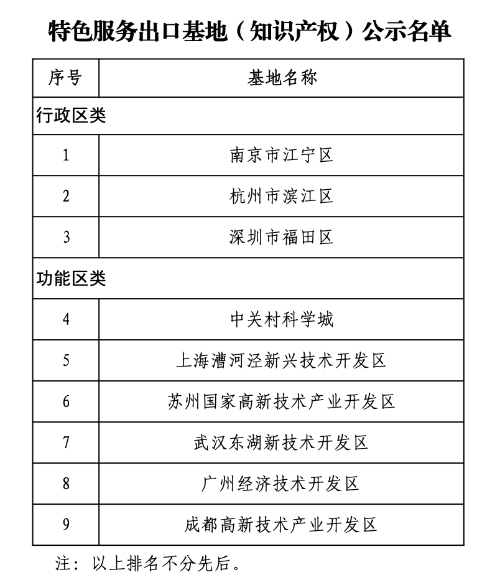據(jù)國家知識產(chǎn)權(quán)局官網(wǎng)消息,根據(jù)《商務(wù)部等7部門辦公廳(室)關(guān)于組織申報專業(yè)類特色服務(wù)出口基地的通知》(商辦服貿(mào)函〔2021〕355號)要求,經(jīng)地方申報、省市知識產(chǎn)權(quán)和商務(wù)主管部門初審?fù)扑]、第三方機構(gòu)客觀指標評審、專家評審、部門工作組復(fù)核等程序,初步認定知識產(chǎn)權(quán)服務(wù)出口基地9家,名單于2月7日-2月11日進行公示。