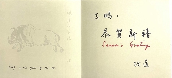 2009年為農(nóng)歷已丑年,俗稱(chēng)牛年。李政道在賀年卡上畫(huà)了一頭健壯的牛。這頭牛騰起四蹄,犄角對(duì)著前方,勇猛無(wú)比。淡淡的筆墨,精準(zhǔn)的線條,黑白的布局,一頭開(kāi)山牛躍然紙上。牛尾的右上部,他用鉛筆輕輕寫(xiě)上了:“仿唐人筆法”。然后簽上了自己名字中的“政”字。