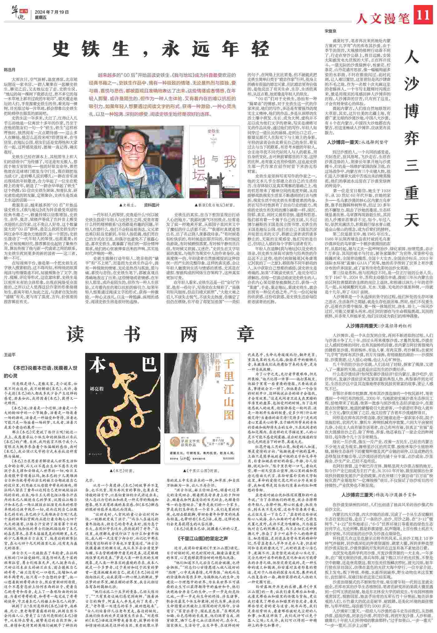 到過沙漠的人,一個共同的感受是,天際蒼茫,狂風怒吼,飛沙走石。生活在沙漠邊緣的人,則要長年累月地與沙漠搏斗,打的是一場維護家園的保衛(wèi)戰(zhàn)。在這場戰(zhàn)爭中,內(nèi)蒙古有三個關鍵人物,他們是人沙博弈大戰(zhàn)中苦練出來的精英模范,他們的事跡永遠留在了沙漠變綠洲的傳說中。