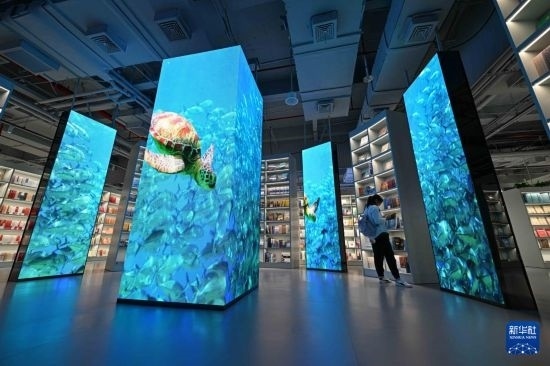 本屆訂貨會,湖南出版展臺凸顯“文化+科技”的深度融合。在精品書臺上方的天幕屏上,一幅輝映湖湘文化神韻的人文山水長卷徐徐展開,滾動播放著2024年度“中南好書”的書封和簡介。