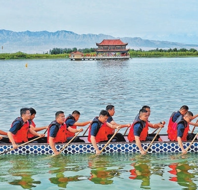 龍舟隊(duì)在甘肅高臺(tái)大湖灣水域競渡。