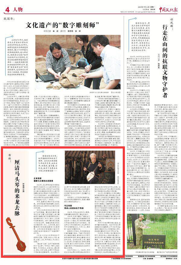 2025年7月14日《中國(guó)文化報(bào)》第4版刊發(fā)了題為《布林:厘清馬頭琴的來龍去脈》的文章,報(bào)道了做為非物質(zhì)文化遺產(chǎn)項(xiàng)目蒙古族馬頭琴音樂代表性傳承人的布林立足民間傳說的同時(shí)又埋頭于各種典籍。他說作為代表性傳承人,有必要更有責(zé)任將馬頭琴的來龍去脈說清楚,對(duì)歷史、對(duì)未來都有個(gè)交代。