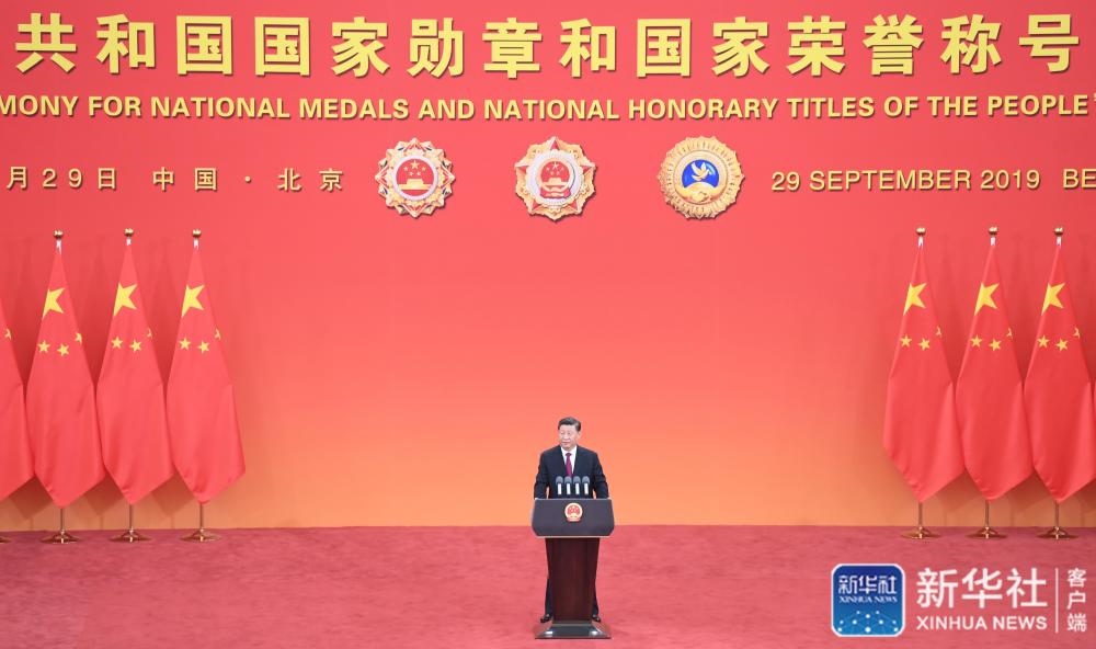 ↑9月29日,中華人民共和國國家勛章和國家榮譽(yù)稱號頒授儀式在北京人民大會堂金色大廳隆重舉行。中共中央總書記、國家主席、中央軍委主席習(xí)近平向國家勛章和國家榮譽(yù)稱號獲得者頒授勛章獎?wù)虏l(fā)表重要講話。新華社記者黃敬文攝