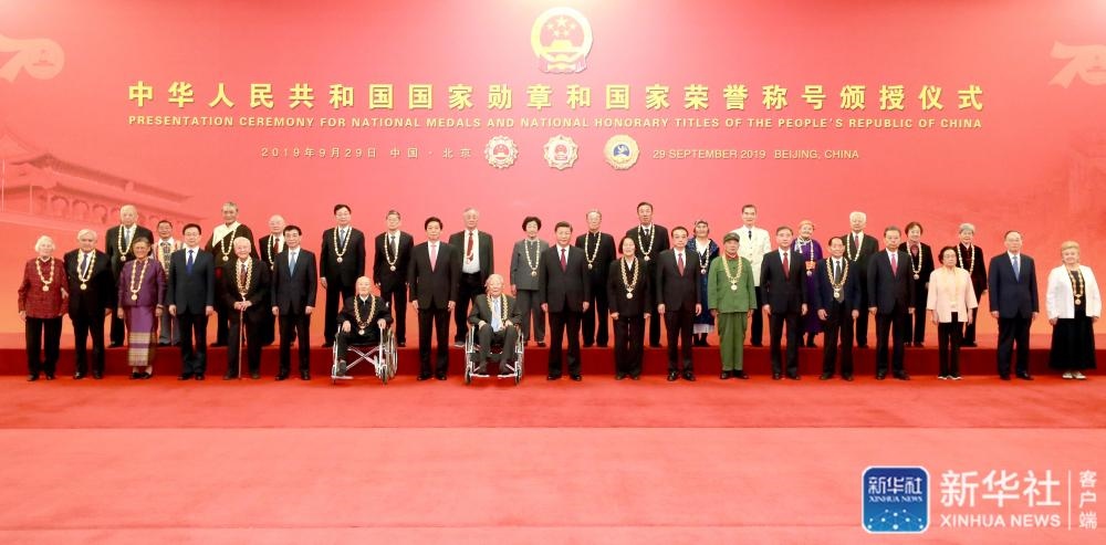 ↑9月29日,中華人民共和國國家勛章和國家榮譽(yù)稱號頒授儀式在北京人民大會堂金色大廳隆重舉行。習(xí)近平等黨和國家領(lǐng)導(dǎo)人同國家勛章和國家榮譽(yù)稱號獲得者合影。新華社記者龐興雷攝