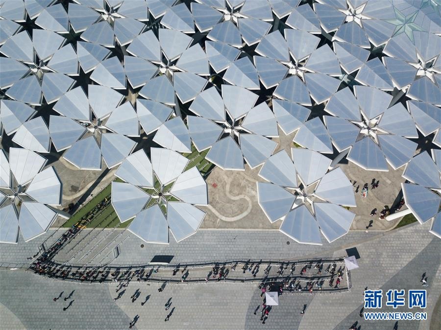 游客在北京世園會(huì)國際館前排隊(duì)參觀(10月7日無人機(jī)拍攝)。