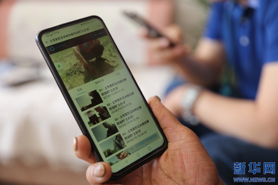 6月10日,內(nèi)蒙古自治區(qū)烏審旗無(wú)定河鎮(zhèn)農(nóng)業(yè)“土專家”在玉米地里針對(duì)小地老虎病蟲(chóng)害問(wèn)題,進(jìn)行線上直播,向當(dāng)?shù)剞r(nóng)民講解防治方法。新華網(wǎng)曹楨攝