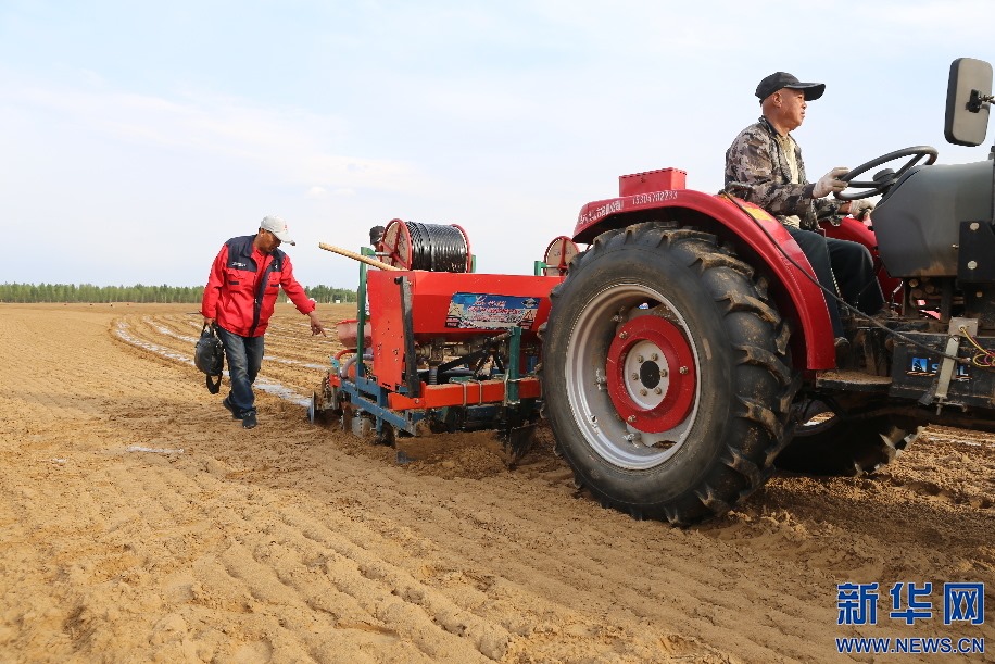 6月12日,內(nèi)蒙古自治區(qū)達(dá)拉特旗天義昌村村民趙培小(左)在地里播種葵花。新華網(wǎng)曹楨攝