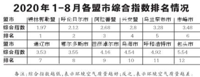 2020年1-8月,全區(qū)環(huán)境空氣質(zhì)量達標天數(shù)比例平均為88.6%。12個盟市達標天數(shù)比例由高至低依次為:呼倫貝爾市(100.0%)、錫林郭勒盟(98.8%)、興安盟(95.9%)、赤峰市(93.4%)、烏蘭察布市(93.4%)、阿拉善盟(92.6%)、鄂爾多斯市(88.5%)、通遼市(88.1%)、巴彥淖爾市(81.0%)、烏海市(79.1%)、包頭市(76.2%)和呼和浩特市(76.2%)。