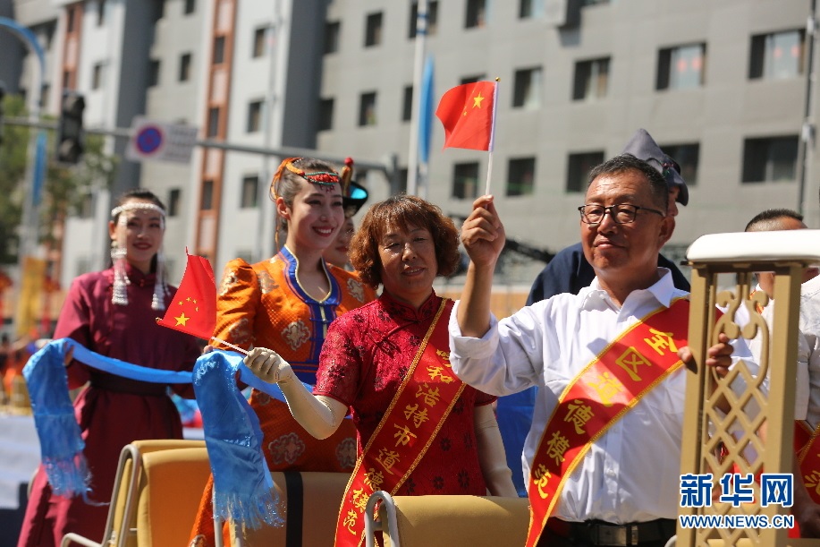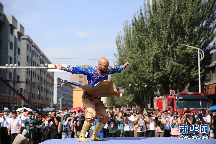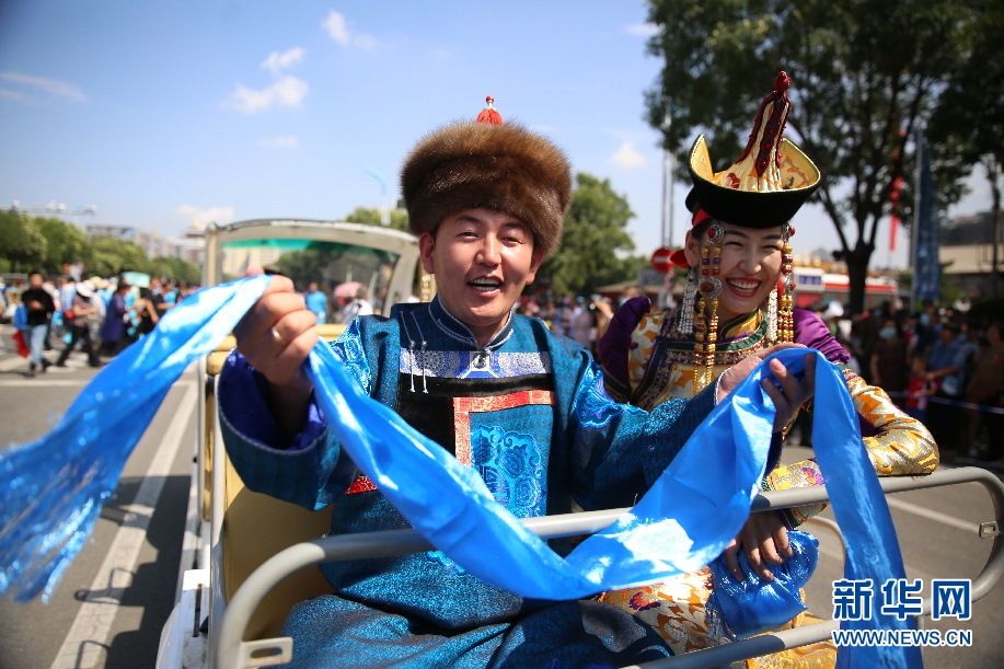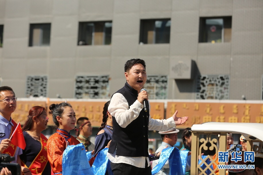 歌手呼斯楞在巡游車上演唱草原歌曲。新華網 楊騰格爾攝