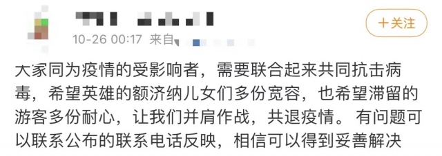 此前,內(nèi)蒙古額濟(jì)納旗文化旅游廣電局發(fā)布《致滯留在額濟(jì)納廣大游客朋友的一封信》,為滯留游客贈(zèng)送胡楊林旅游區(qū)(5A)等3個(gè)核心景區(qū)門票1張,自2021年起,三年內(nèi)可免費(fèi)游覽。