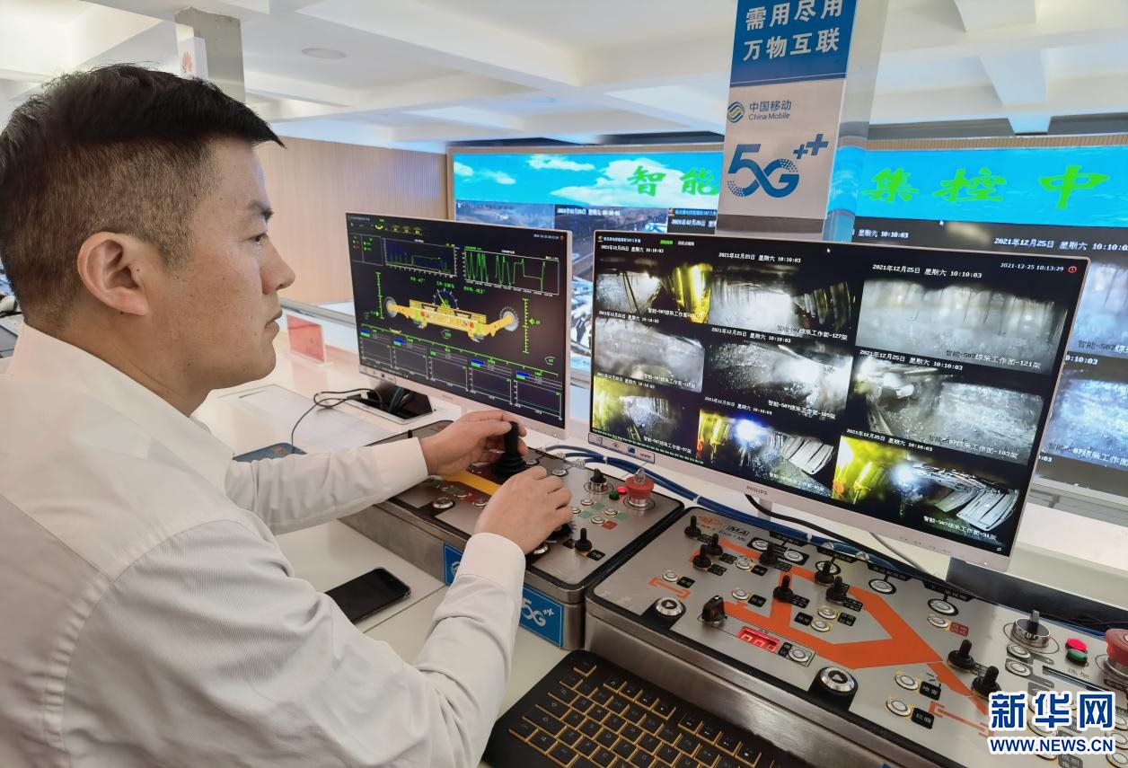 在智能調(diào)度集控中心,1名井下采煤掘進(jìn)機(jī)司機(jī)坐在辦公室里,看著顯示器上實(shí)時(shí)回傳的井下畫面,手握操縱桿遠(yuǎn)距離控制井下的采煤掘進(jìn)機(jī)進(jìn)行掘采。據(jù)介紹,智能集控中心僅需8個(gè)人,就可以幫助煤礦實(shí)現(xiàn)全年800萬(wàn)噸產(chǎn)量。
