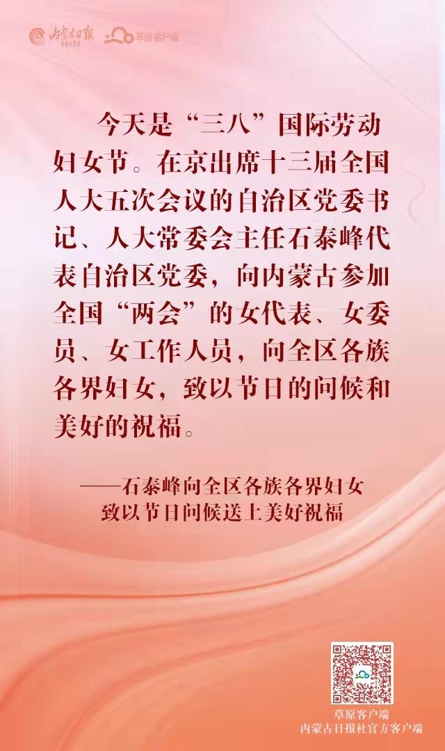 今天是“三八”國(guó)際勞動(dòng)?jì)D女節(jié)。在京出席十三屆全國(guó)人大五次會(huì)議的自治區(qū)黨委書(shū)記、人大常委會(huì)主任石泰峰代表自治區(qū)黨委,向內(nèi)蒙古參加全國(guó)“兩會(huì)”的女代表、女委員、女工作人員,向全區(qū)各族各界婦女,致以節(jié)日的問(wèn)候和美好的祝福。(內(nèi)蒙古日?qǐng)?bào)社融媒體記者 章奎)