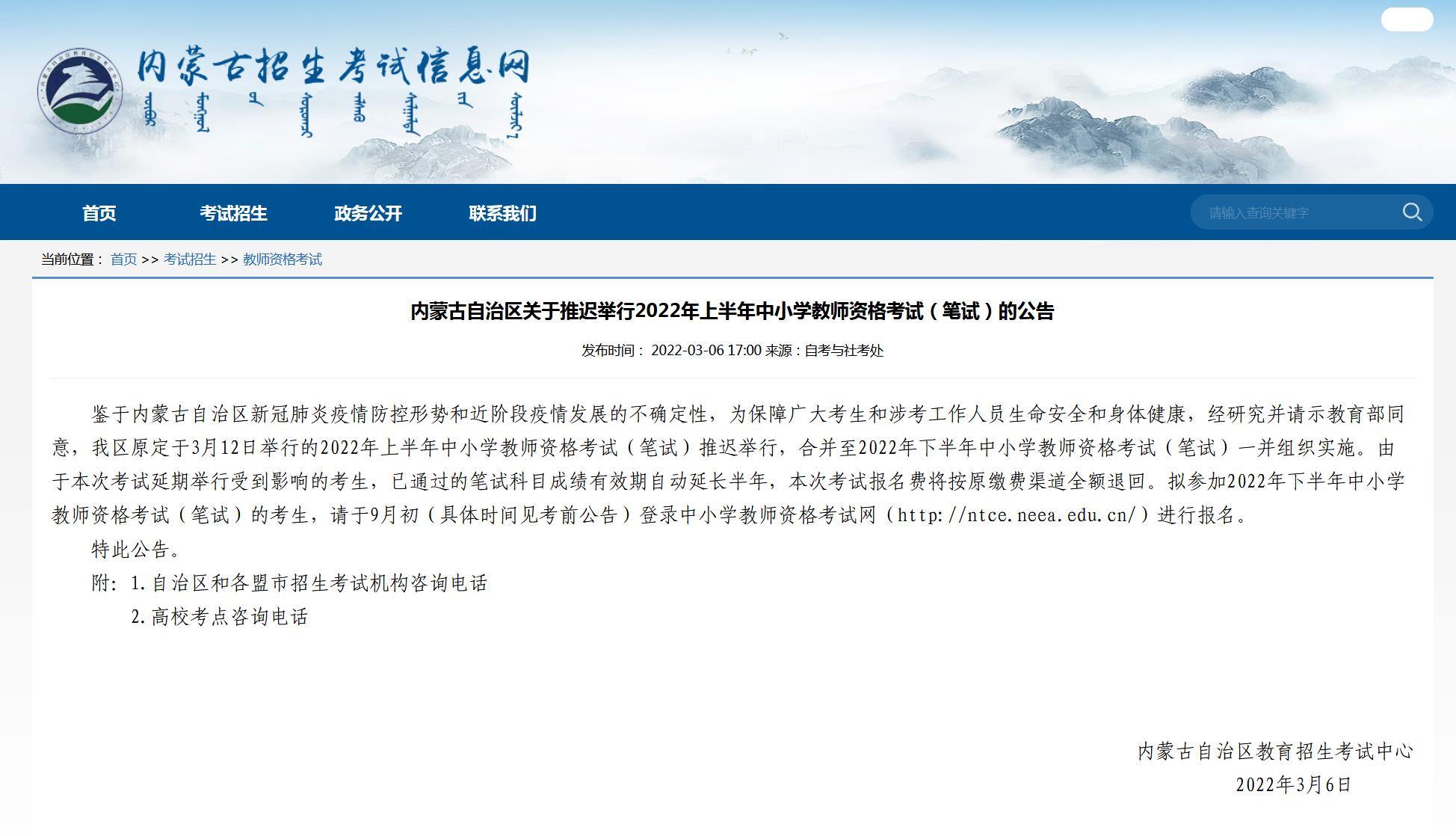 據(jù)內(nèi)蒙古招生考試信息網(wǎng)消息,3月6日,內(nèi)蒙古自治區(qū)教育招生考試中心發(fā)布公告稱,鑒于內(nèi)蒙古自治區(qū)新冠肺炎疫情防控形勢(shì)和近階段疫情發(fā)展的不確定性,為保障廣大考生和涉考工作人員生命安全和身體健康,經(jīng)研究并請(qǐng)示教育部同意,原定于3月12日舉行的2022年上半年中小學(xué)教師資格考試(筆試)推遲舉行,合并至2022年下半年中小學(xué)教師資格考試(筆試)一并組織實(shí)施。由于本次考試延期舉行受到影響的考生,已通過的筆試科目成績(jī)有效期自動(dòng)延長(zhǎng)半年,本次考試報(bào)名費(fèi)將按原繳費(fèi)渠道全額退回。