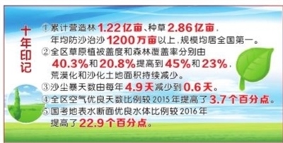 累計營造林1.22億畝、種草2.86億畝,年均防沙治沙1200萬畝以上,規(guī)模均居全國第一;全區(qū)草原植被蓋度和森林覆蓋率分別由40.3%和20.8%提高到45%和23%,荒漠化和沙化土地面積持續(xù)減少;全區(qū)空氣優(yōu)良天數(shù)比例較2015年提高3.7個百分點,國考地表水?dāng)嗝鎯?yōu)良水體比例較2016年提高22.9個百分點……