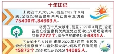 數(shù)據(jù)顯示,黨的十八大以來(lái),截至2022年8月底,全區(qū)紀(jì)檢監(jiān)察機(jī)關(guān)立案審查調(diào)查75400件、84669人,做到有腐必反、除惡務(wù)盡,推動(dòng)政治生態(tài)持續(xù)向上向好。