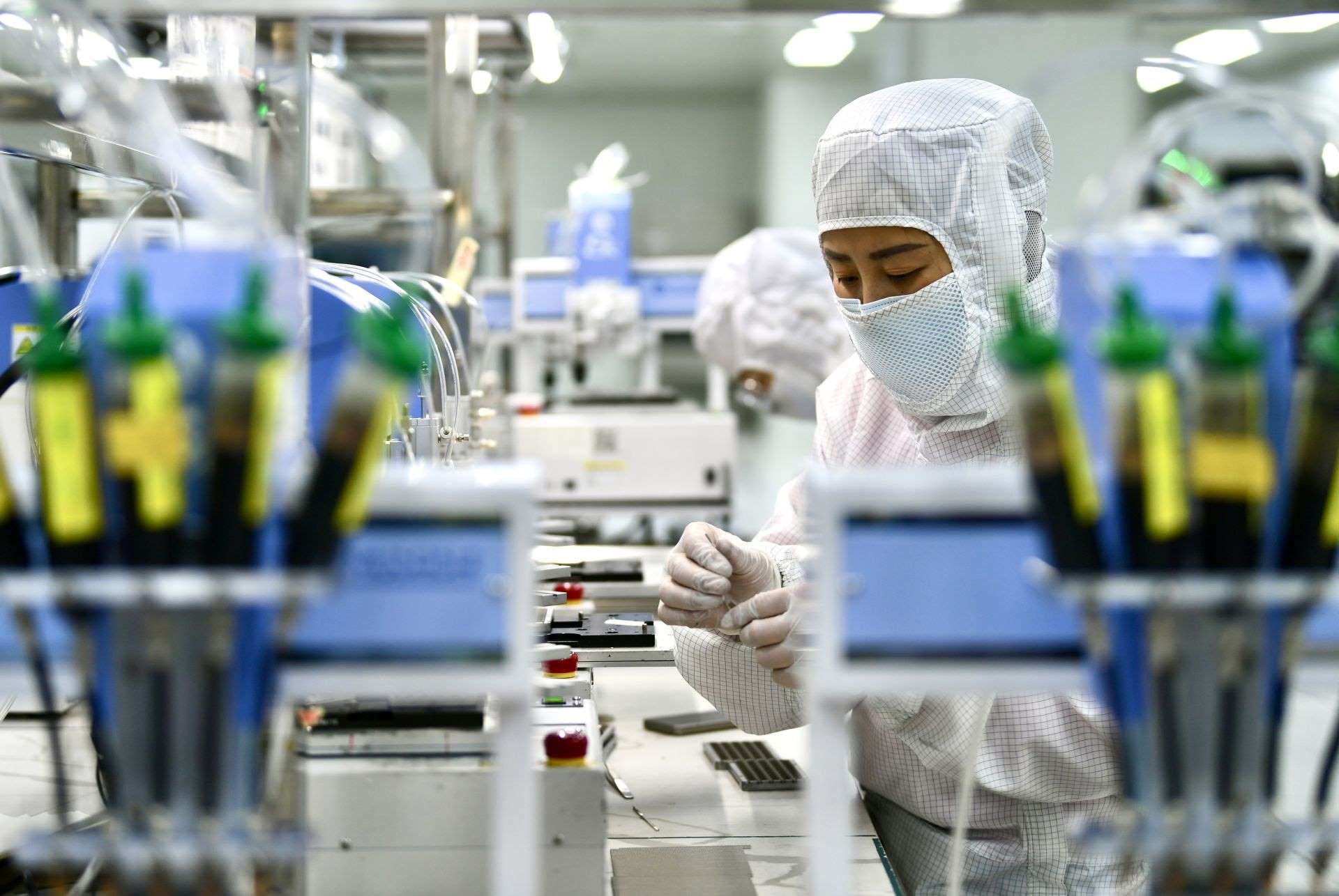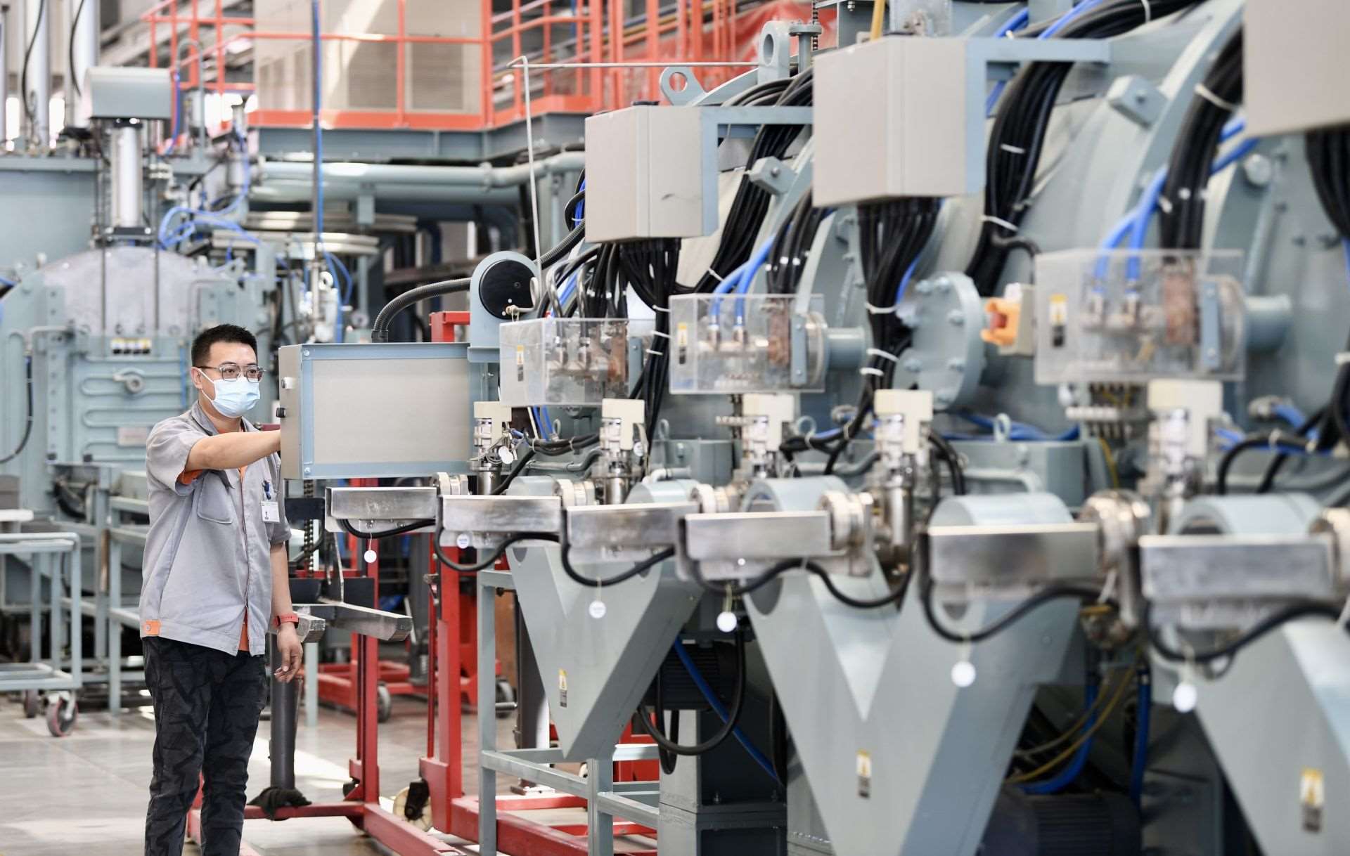 在包頭市稀土高新區(qū)大地熊(包頭)永磁科技有限公司生產(chǎn)車間內(nèi),技術(shù)人員查看設(shè)備運(yùn)行情況。