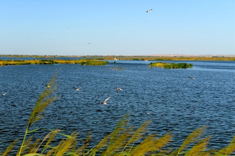 烏蘭布和沙漠境內(nèi)的天鵝湖濕地上候鳥飛翔