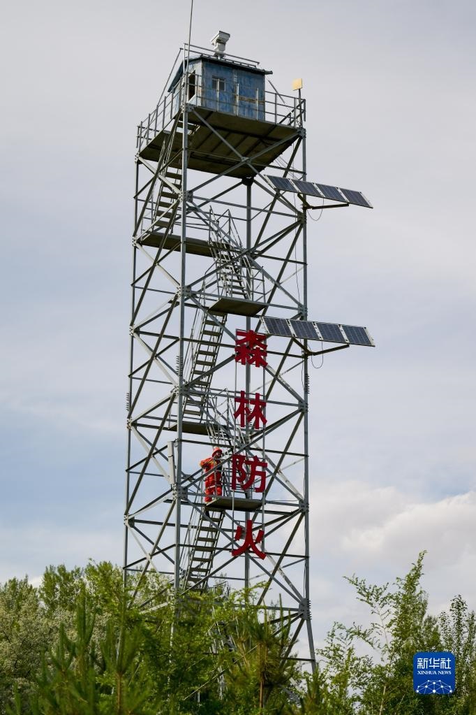 6月5日,臨河區(qū)國營新華林場(chǎng)護(hù)林員登上瞭望塔準(zhǔn)備開展巡護(hù)工作。新華社記者 李志鵬 攝
