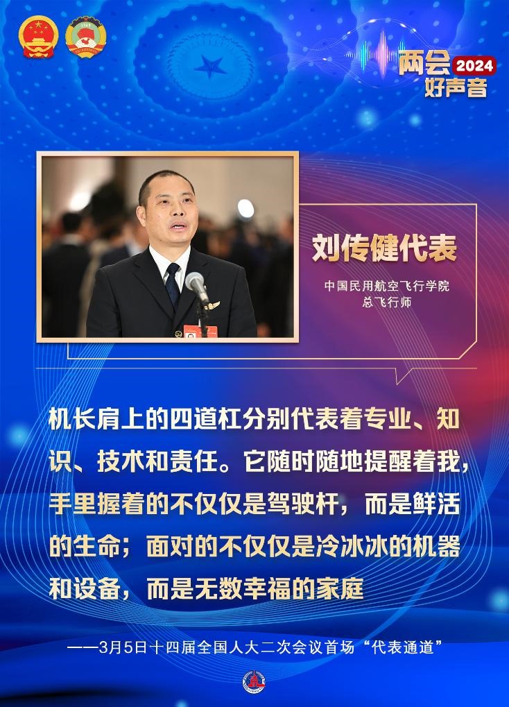 劉傳健說:“機(jī)長肩上的四道杠分別代表著專業(yè)、知識、技術(shù)和責(zé)任。它隨時隨地提醒著我,手里握著的不僅僅是駕駛桿,而是鮮活的生命;面對的不僅僅是冷冰冰的機(jī)器和設(shè)備,而是無數(shù)幸福的家庭?!?/p>