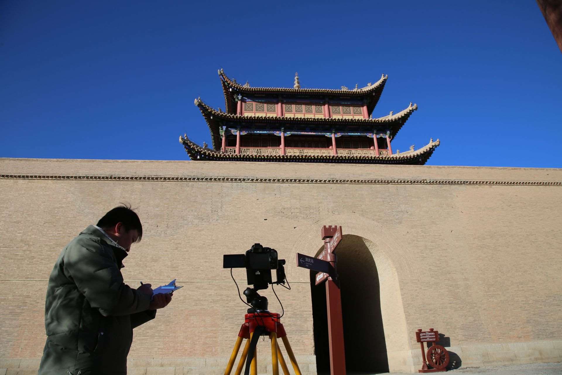 1月29日,嘉峪關絲路(長城)文化研究院文化遺產(chǎn)監(jiān)測中心工作人員高商,正在對柔遠樓城臺裂縫進行定期監(jiān)測。戈壁上的風很“硬氣”,高商寫字的手有點不聽使喚:“當長城醫(yī)生可不能偷懶,‘定期查體’都要做得仔仔細細,這樣才能及時‘防病治病’?!蓖略谏砗笄那陌聪驴扉T,高商渾然不覺。