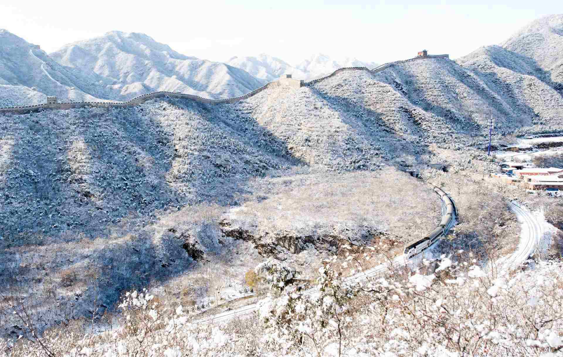 白雪皚皚,北京居庸關長城銀裝素裹綿延于山脊之上。山腳下,S2線列車迎面而來穿越雪海。