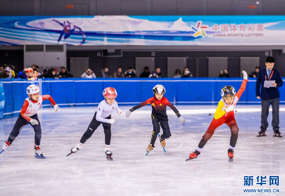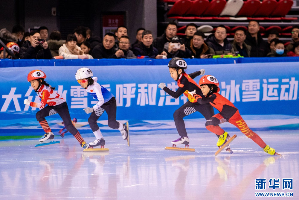 ??12月15日,參賽小選手在呼和浩特市冰雪運(yùn)動(dòng)系列活動(dòng)短道速滑公開(kāi)賽比賽中。新華網(wǎng)發(fā)(丁根厚 攝)